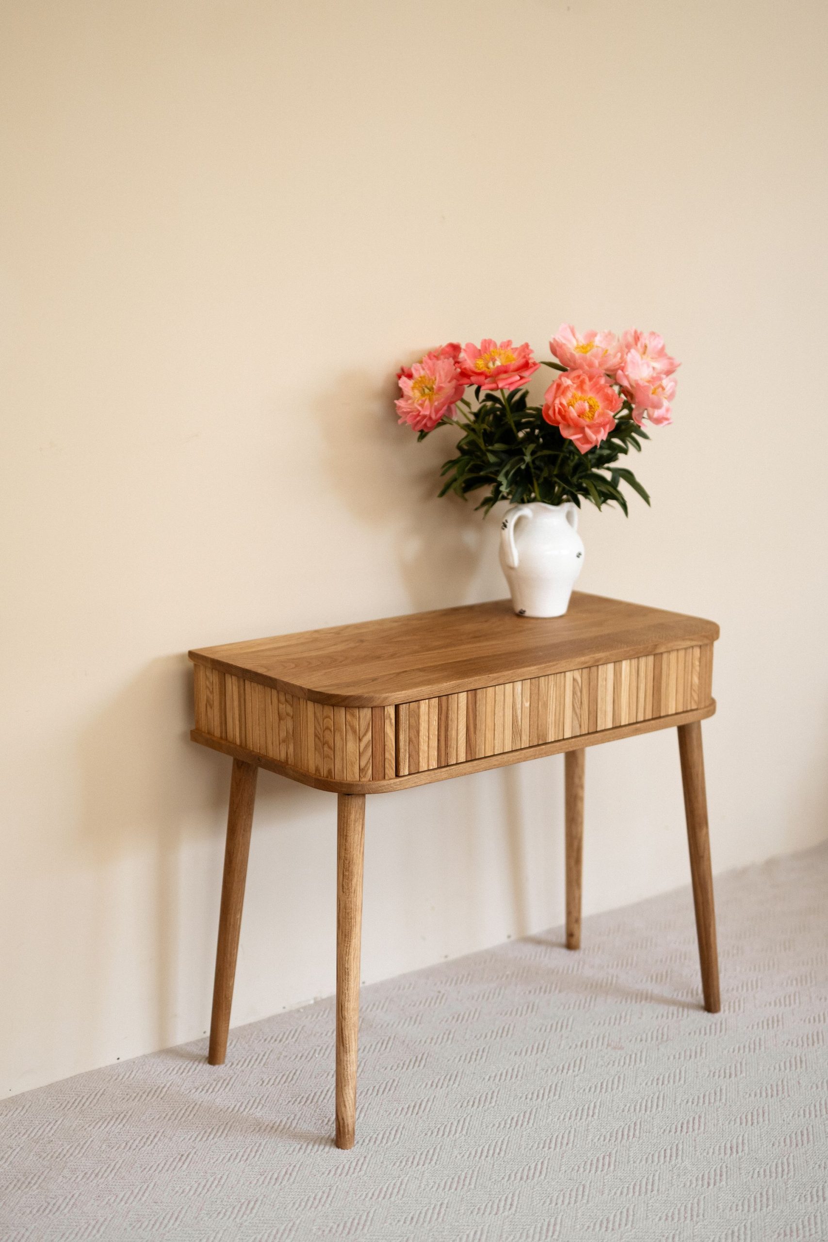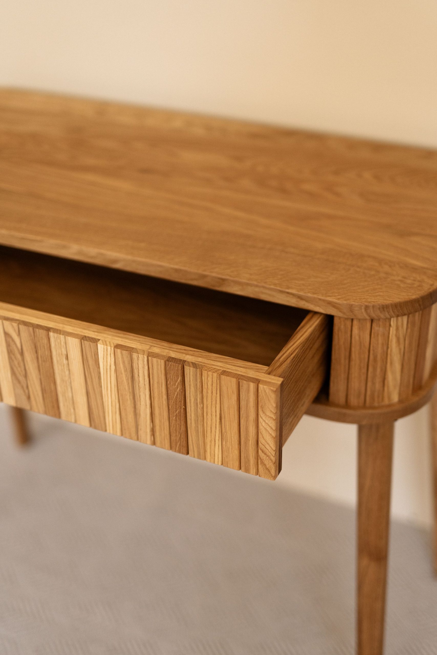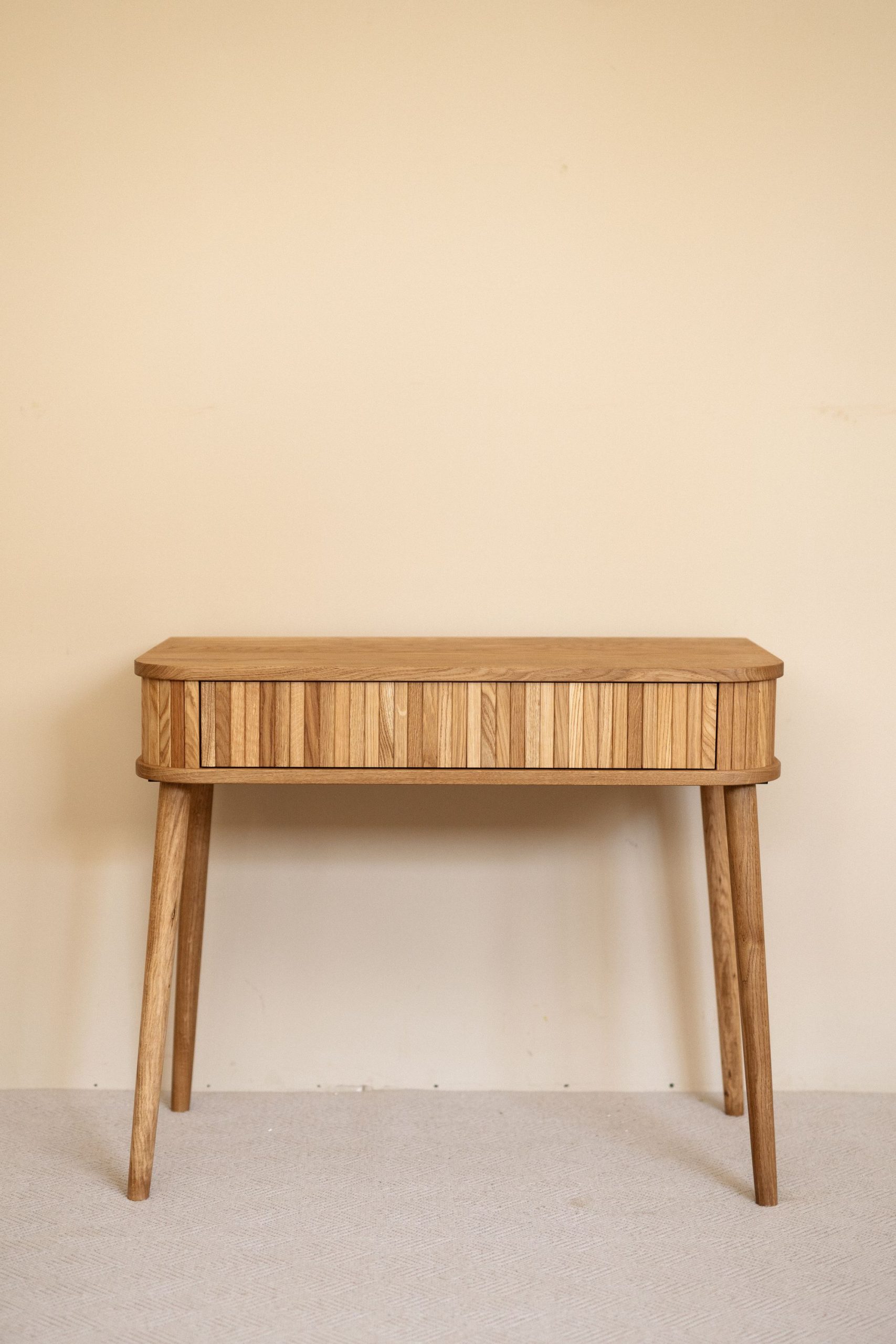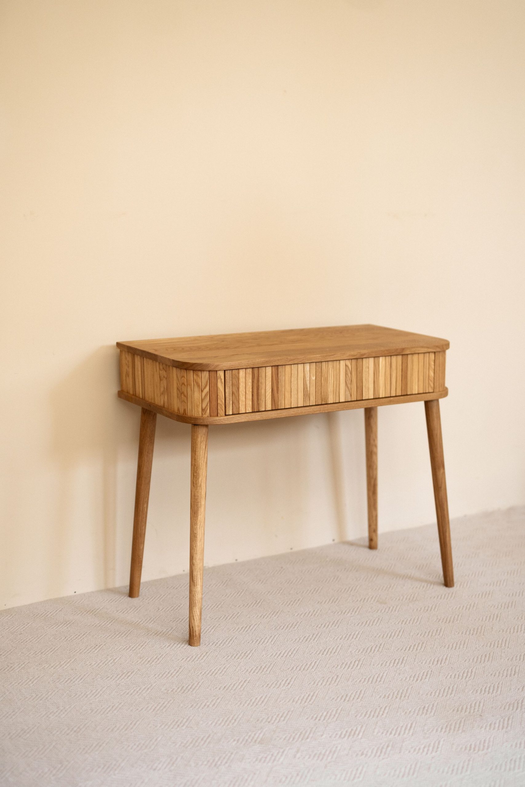 Туалетный столик с рейками — про спокойствие и тактильность. Натуральное дерево, простые линии, мягкие формы. Фасад с вертикальным ритмом создает ощущение лёгкости и уюта. Изделие не перегружает пространство, а деликатно подчёркивает атмосферу дома — здесь хочется замедлиться, вдохнуть глубже и просто быть собой.